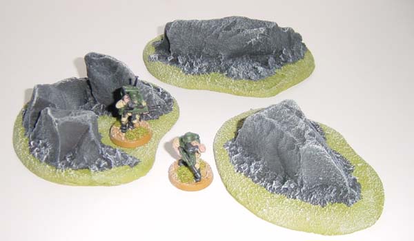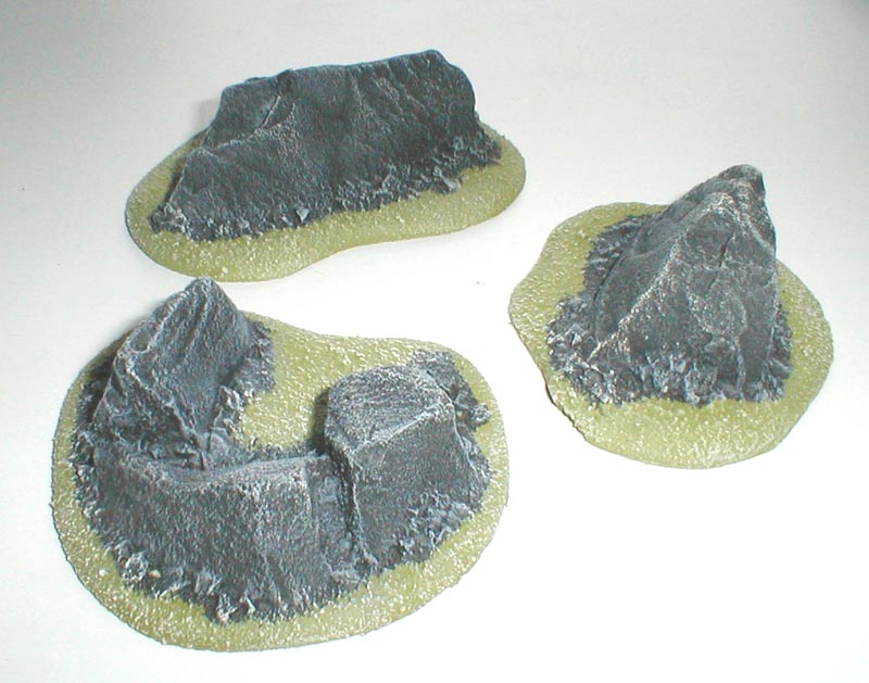 GNRCKG001 - Slate Grey Rocks This pack contains 3 pieces and range from 25mm - 40mm high. They are finished in grey with a green base that matches our green hill range. A further highlight brings out the rock texture. |