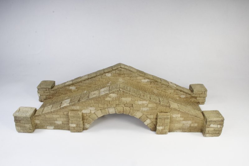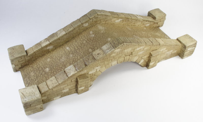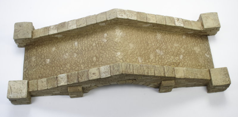 GNBRI007 - Bridge - Sand A single arch bridge. Overall length 290mm, width 110mm. The road way is 60mm wide and the side parapet is 18mm high. The arch is 85mm wide and 30mm high at its centre. This shows a view from the top and this a view from the side. |