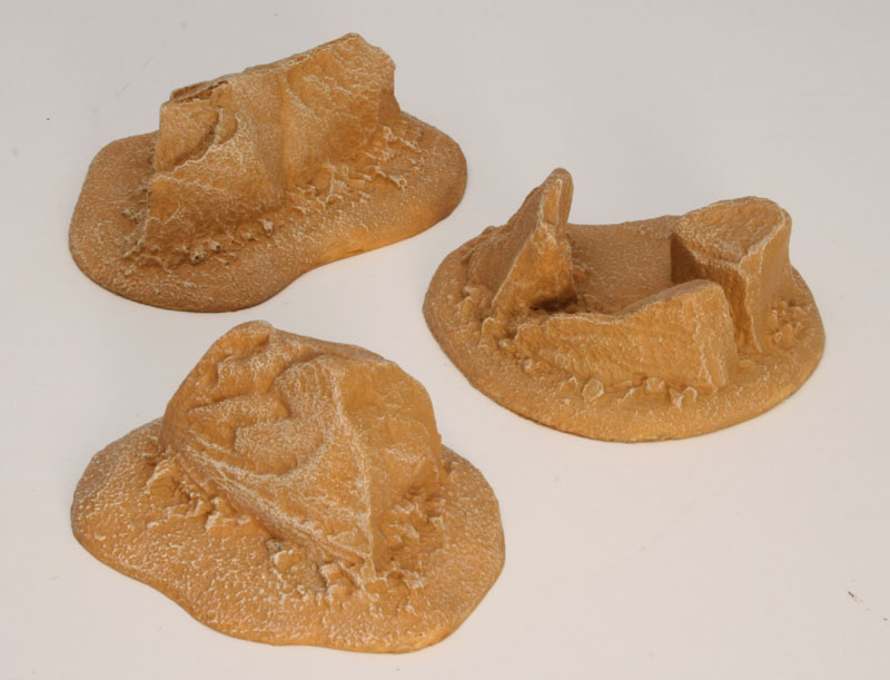 GNRCKS002 - Sand Rocks This pack contains 3 pieces and range from 25mm - 40mm high. They are finished in sand with a sand base that matches our sand hill range. A further highlight brings out the rock texture. |