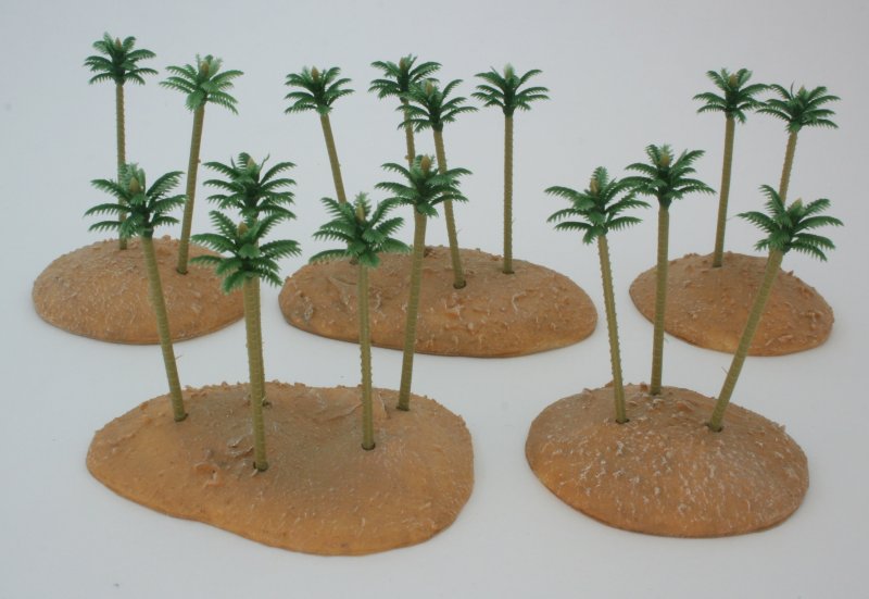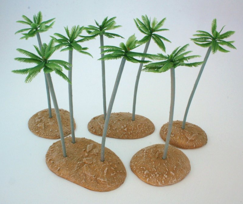 GNTREE006 - Palm Grove (7cm) This pack contains sixteen 7cm palm trees with five bases so the trees will stand upright. The bases have holes to take two, three, four or five trees. |